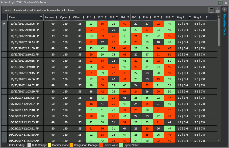 The Adaptive Action Log will display the commands taken by the adaptive system in a grid display. The asset number and name of the associated intersection is shown in the tab title.