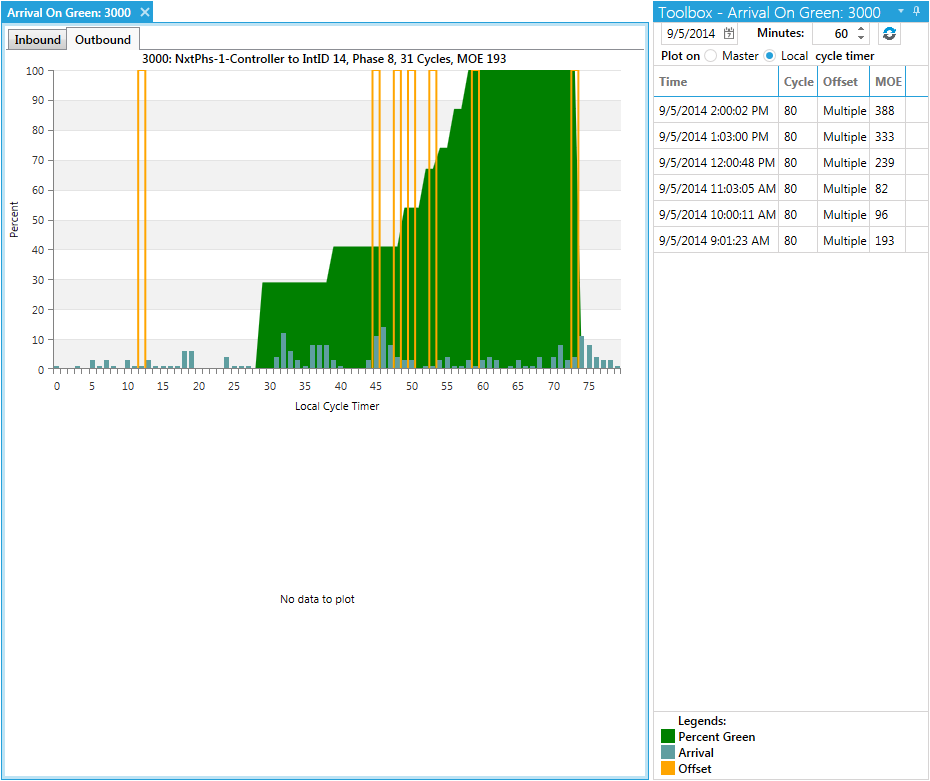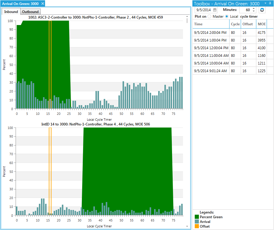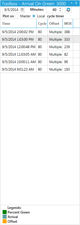 The Arrival on Green graph shows the vehicle occupancy and green time for each phase (inbound and outbound) averaged over the specified number of cycles. The Percent Green portion of the graph shows the percentage of time that the given phase was green averaged over the specified number of cycles. The Arrival portion of the graph shows the vehicle occupancy for each second, averaged over the specified number of cycles. Finally, the Offset line(s) shows the offset for that cycle or, if viewing an average over multiple cycles, each of the different offsets that occurred over each of the cycles. The green portion of the graph represents the green time over the given time segment. The yellow vertical lines display the offset and the blue lines show detector data. This color legend is also shown at the bottom of the Arrival On Green Toolbox.