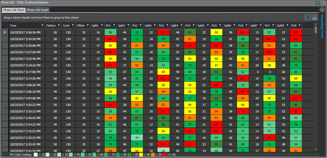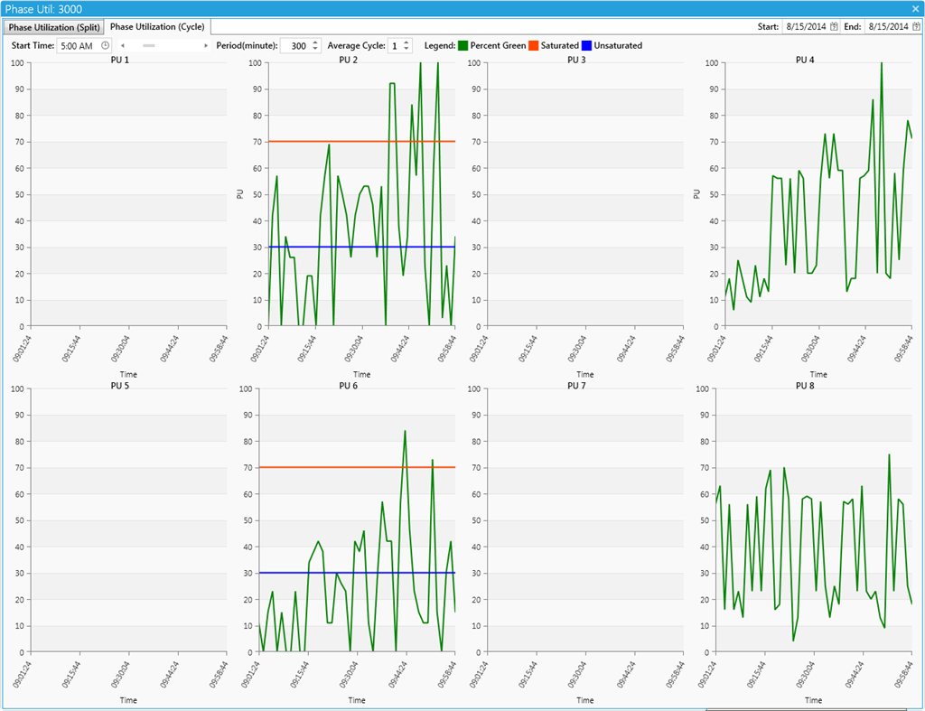 The Phase Utilization graphic will display pattern, cycle lengths, offsets, and splits, as well as the corresponding phase utilizations for each full cycle.