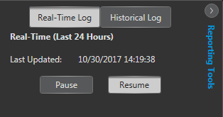 A user may change the range of dates shown by using Reporting Tools. The Reporting Tools section is located at the top right of the window and can be expanded or hidden using the arrow icon. By default, the chart shows real-time information, but the start and end dates can be customized using the Historical Log settings. The Real-Time Log may also be paused, so that it displays the most recent 24 hours of information at the time the pause button was clicked, but does not update with newer data.