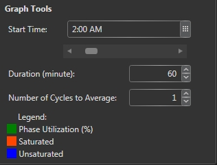 Similar to the Chart functionality, there is a Date Range filter in the Reporting Tools at the top right of the page. Graph Tools are available at the bottom of the Reporting Tools section, allowing a user to adjust the start time by typing a value in, using the dropdown, or using the slider near the dropdown. In addition to Date and Time filters, there is a Duration setting and Average Cycle adjustment as well as a Legend available to the user.