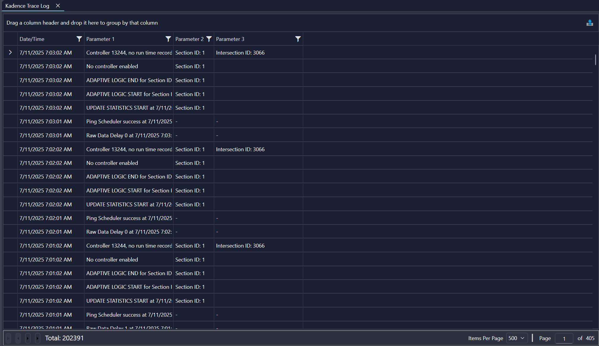 To view Trace Log Events in real-time select a Section or Intersection and make sure Real-Time is turned on. This will populate the Trace Log page with all of the Adaptive operations that are taking place in real-time. At any point, the user can click the Pause button to stop any new data from being displayed so they can easily go through and analyze the Trace Log Events.