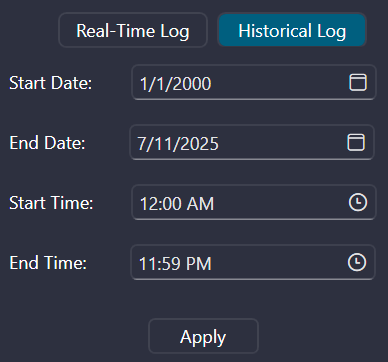To view Trace Log Events for a specific date and time range use the Date/Time Filter to select the desired date as well as the start and end times. Once the desired range is set, click Apply to display the appropriate Trace Log Events.