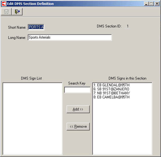 The Edit DMS Section Definition form allows the user to name a DMS Section and add or remove signs to the DMS Section. To open this form, either click the New button or select an existing Section and click the Edit button on the DMS Section List.