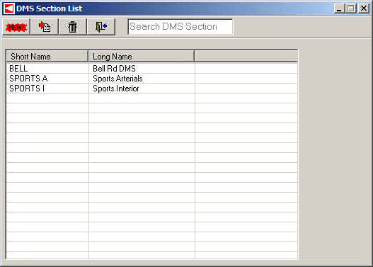 The DMS Section List displays the defined short name and long name of each DMS Section. Buttons at the top of the form allow the user to add, edit, or delete a DMS Section.