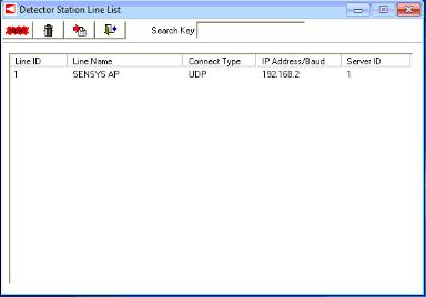 The Detector Station Lines are displayed in the Detector Station Line List form. The user defined parameters of line name, connection type, IP address, and server ID are shown.