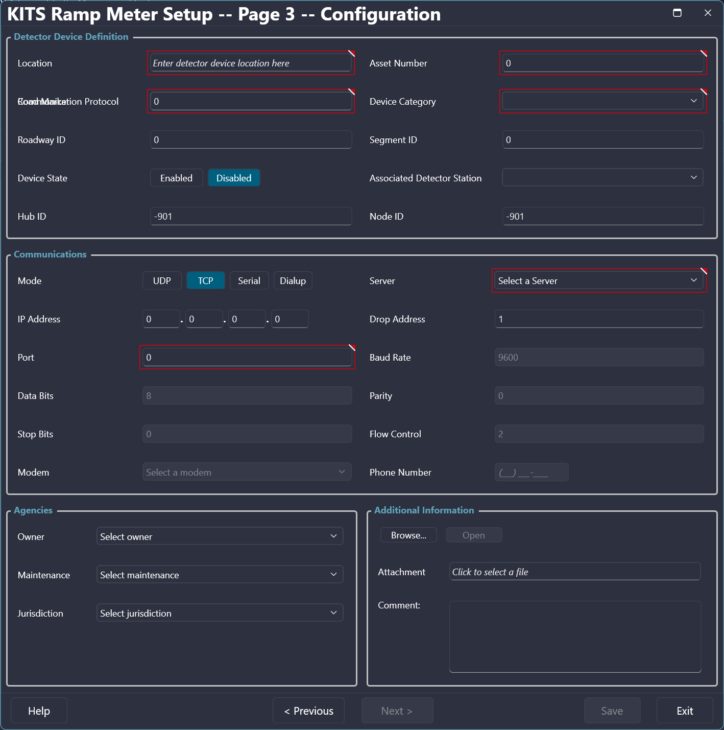 After the pin has been placed, the parameter definition section of the Wizard becomes available. Required attributes are outline in red. After completing the definition entry, the Save button will be enabled allowing the user to finalize the device and close the Wizard. If Previous or Exit is selected before saving, any data entered will be lost.