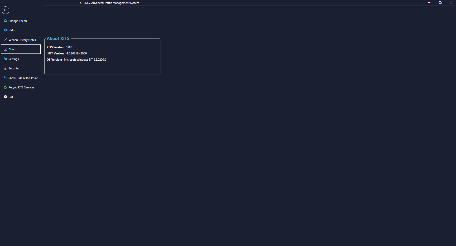 This form allows the user to view information about KITS such as the KITS Version, .NET Version, and the OS Version.