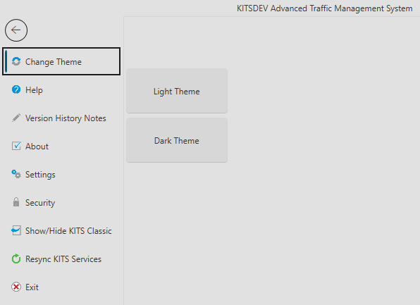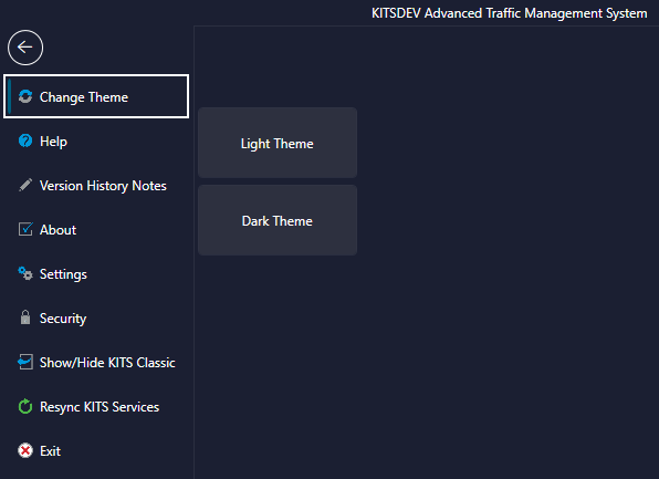 The user has two theme options available for customizing the look and feel of the Enhanced KITS GUI. To change the theme, navigate to the Admin tab, and select the option from the Change Theme item. The UI will need to be restarted before theme changes take effect.