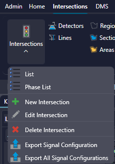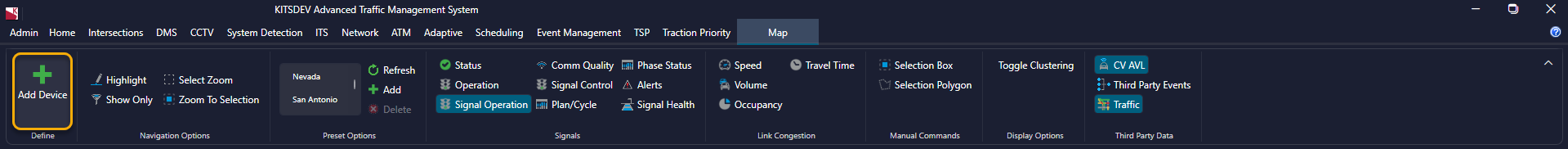 The device definition wizard is used for many types of devices, including Intersections, DMS, CCTV/VID, Adaptive Intersection Link, Road Segment, Gantry, Detector Station, Ramp Meter, Beacon, Road Weather Information System (RWIS), and Highway Advisory Radio (HAR). The device definition wizard can be accessed from the Add Device button on the Map ribbon menu tab (which is visible only when a Map is open). Shortcuts to the wizard for a specific device type can be found on the ribbon menu tab relating to that device. Please use the links above for more information about defining a given device type.