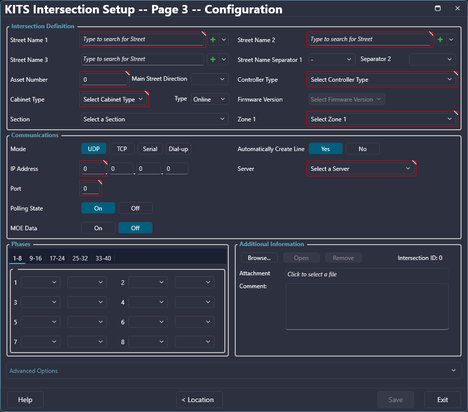 An intersection is configured in Page 3 of the Intersection Wizard. This allows the definition of an intersection's required attributes with the required fields outlined in red. After completing the definition entry for an intersection, the Save button will be enabled allowing the user to finalize the intersection and close the Intersection Wizard. If Previous or Exit is selected before saving, any data entered will be lost.