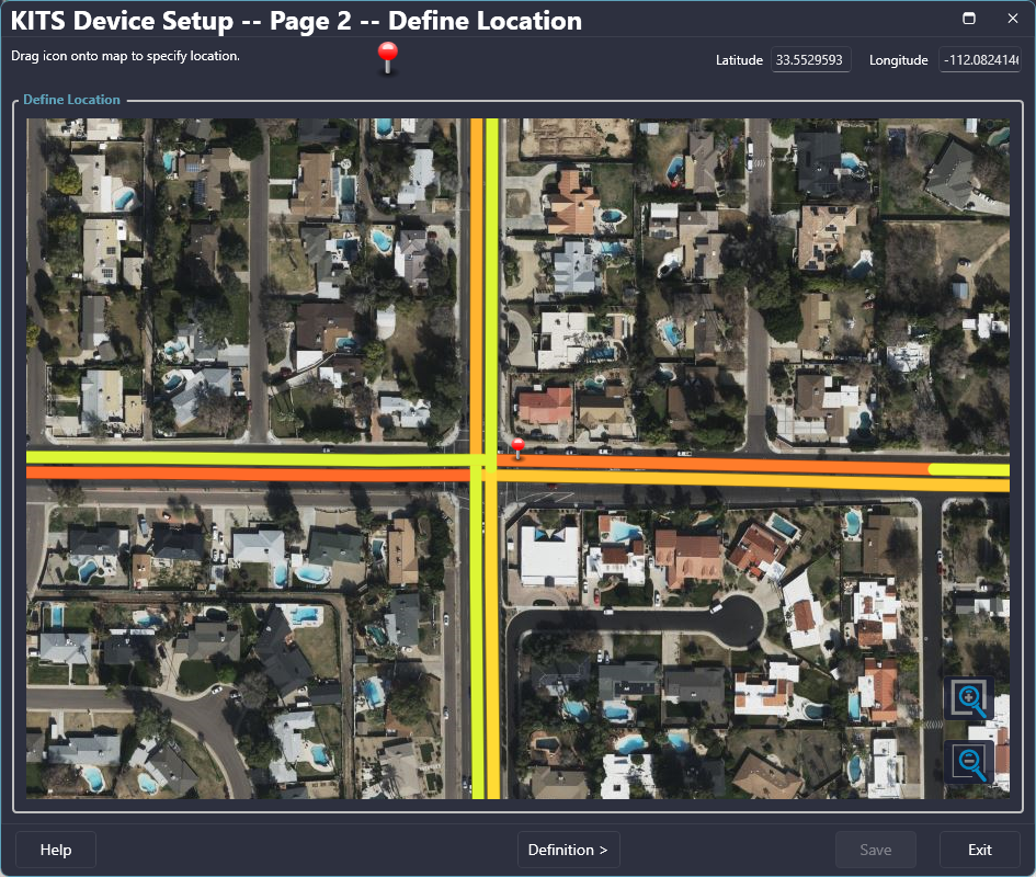 When adding a new intersection, the location can be set by using the third option above, right clicking on the map to open the Add New Device Wizard. The location can also be set or edited from the 'Define Location' form. If it is a new intersection and a pin has not been placed, click and drag the pin at the top of the form to the desired location. If a pin has already been dropped, it can be relocated by clicking on it and dragging it to the desired location.