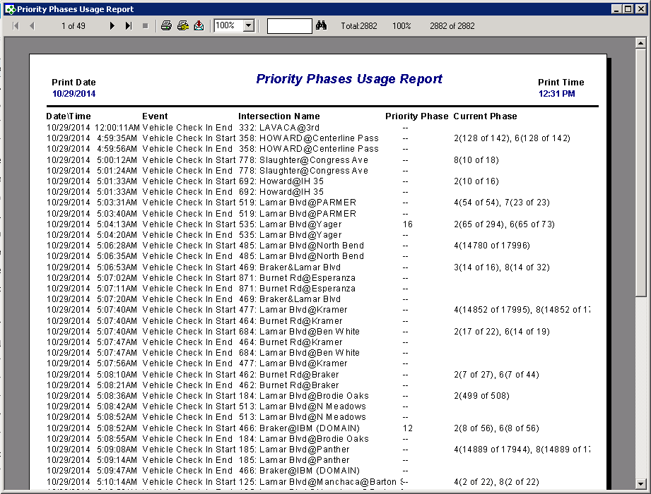 The report is then generated based on the users selections as shown below. The events are ordered by the Date/Time showing the Intersection Name, Priority Phase and Current Phase. The Current Phase column shows the phase(s) that were green when the vehicle check-in event occurred as well as how many seconds the light had been green for.