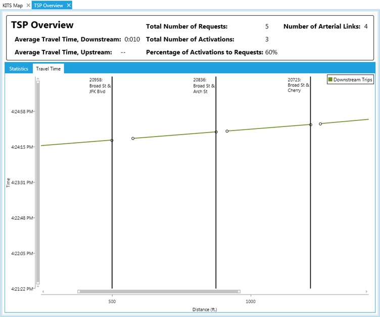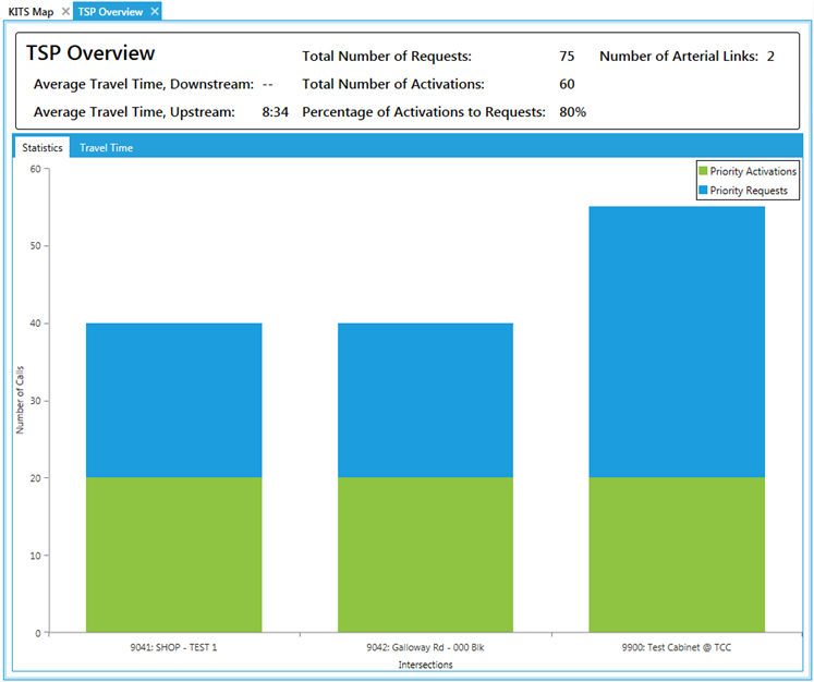 The TSP Overview form found within the Intersections tab provides two main views including Statistics and Travel Time pages.