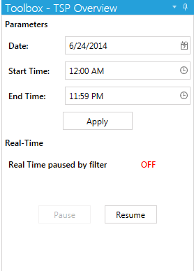 Upon opening the form, the associated toolbox becomes visible. First select the desired date and time and choose whether or not to pause the Real-Time filter, then press Apply.